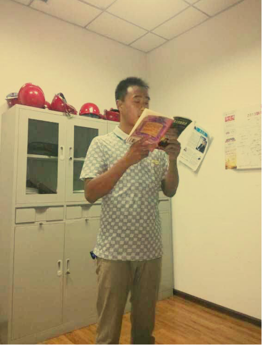 操着一口方言的冯万运深知,作为一个置业顾问,普通话必须要过关。这时,他的领导武总给他布置了任务:下载羊皮卷,用普通话朗读。并且还给案场其他同事规定:“谁听到冯万运在案场不说普通话,一句就可以罚冯万运一元”!每天,他都很自觉地读一个小时的羊皮卷,从未间断。很快地,在自己的努力和大家的帮助下,他的普通话过关了,并且在与人沟通和交流时更加自信了。